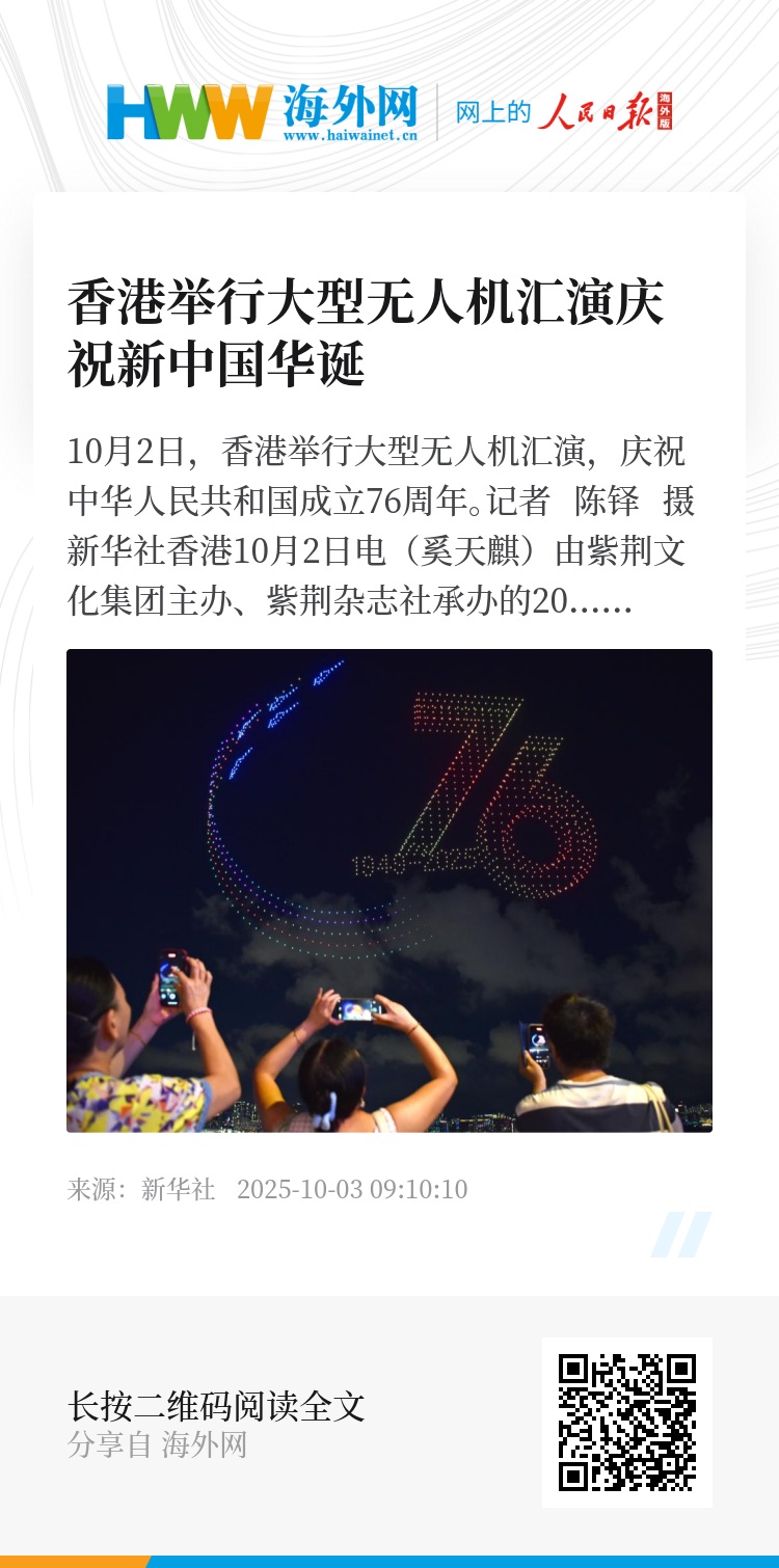 新华社香港10月2日电(奚天麒)由紫荆文化集团主办、紫荆杂志社承办的2025年国庆无人机表演2日在香港举行。