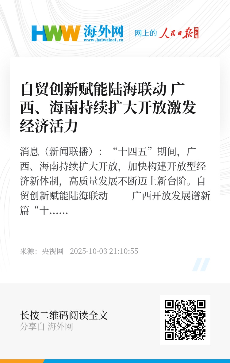央视网消息(新闻联播):“十四五”期间,广西、海南持续扩大开放,加快构建开放型经济新体制,高质量发展不断迈上新台阶。