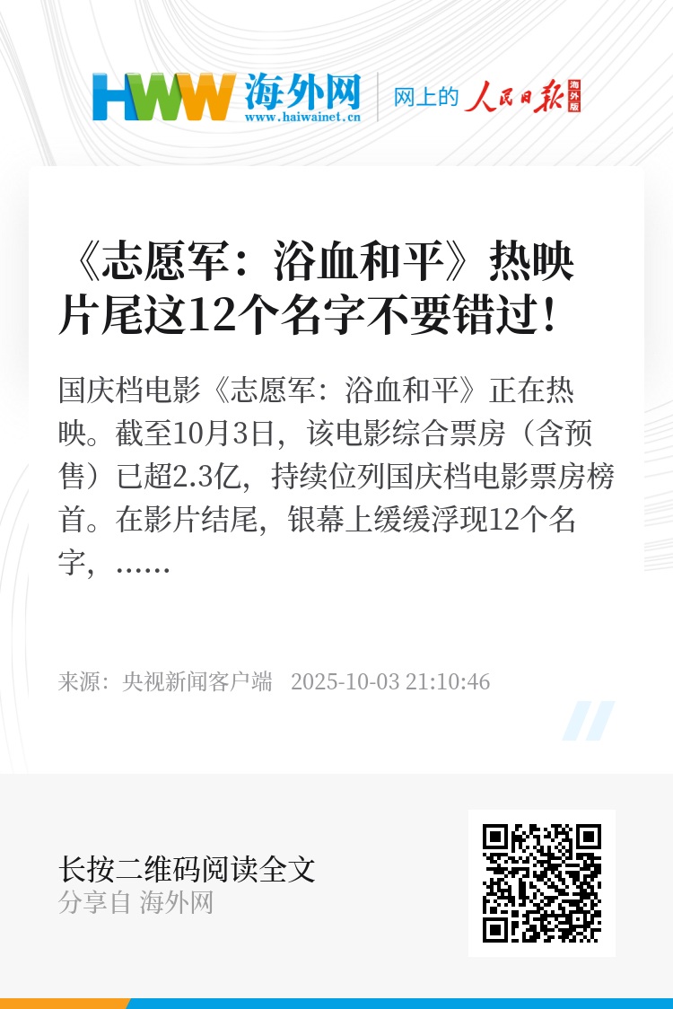 国庆档电影《志愿军:浴血和平》正在热映。截至10月3日,该电影综合票房(含预售)已超2.3亿,持续位列国庆档电影票房榜首。