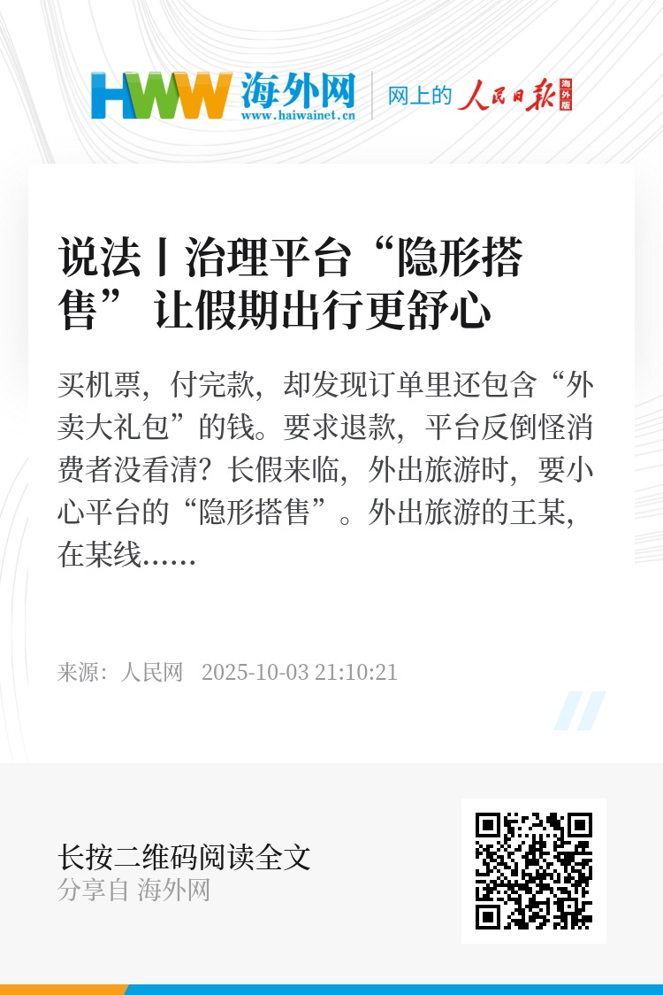 国庆中秋长假来临,本期“说法”关注在线旅游生活服务类平台中的“隐形搭售”。(金歆)