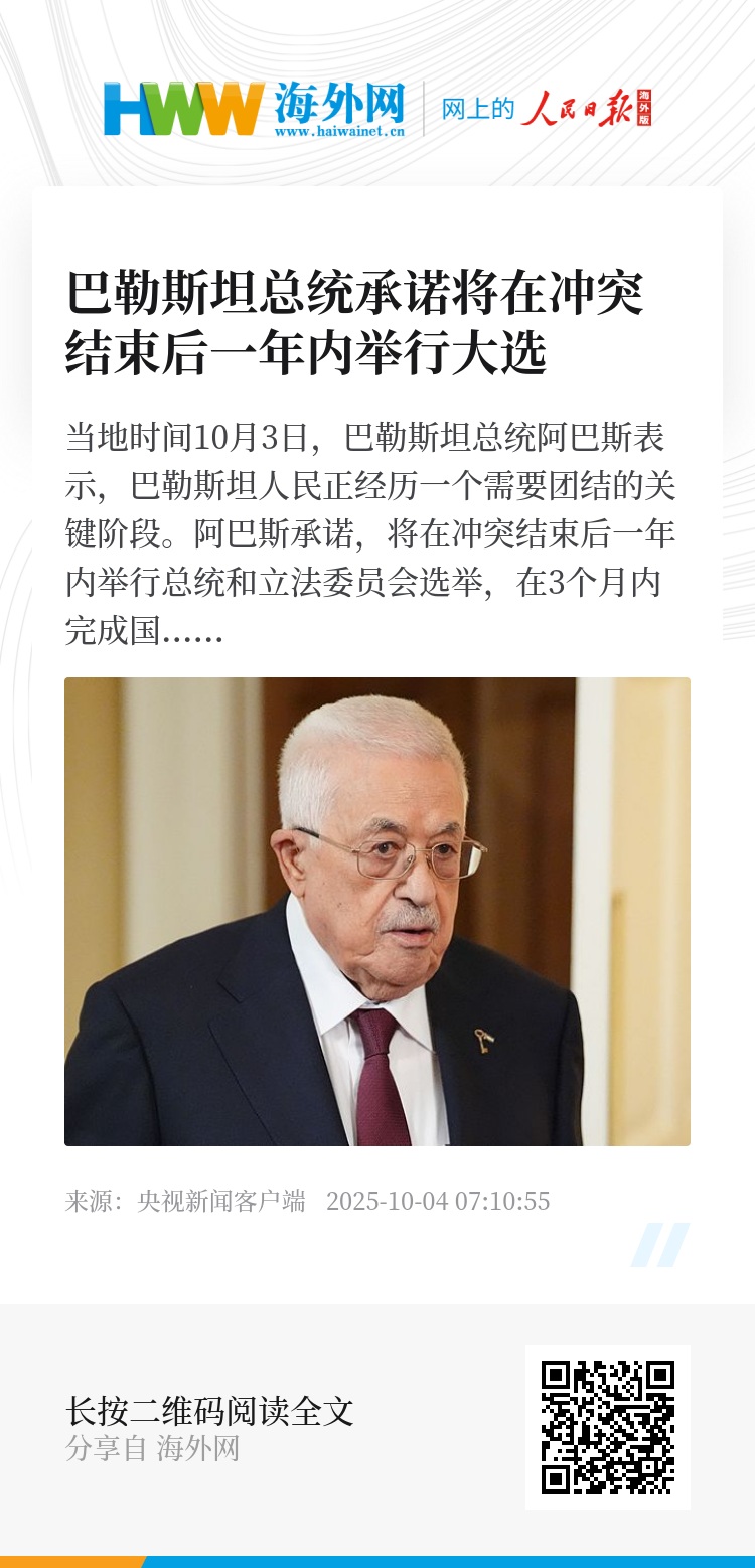 当地时间10月3日,巴勒斯坦总统阿巴斯表示,巴勒斯坦人民正经历一个需要团结的关键阶段。阿巴斯承诺,将在冲突结束后一年内举行总统和立法委员会选举,在3个月内完成国家临时宪法的制定,作为权力向国家移交的基础。