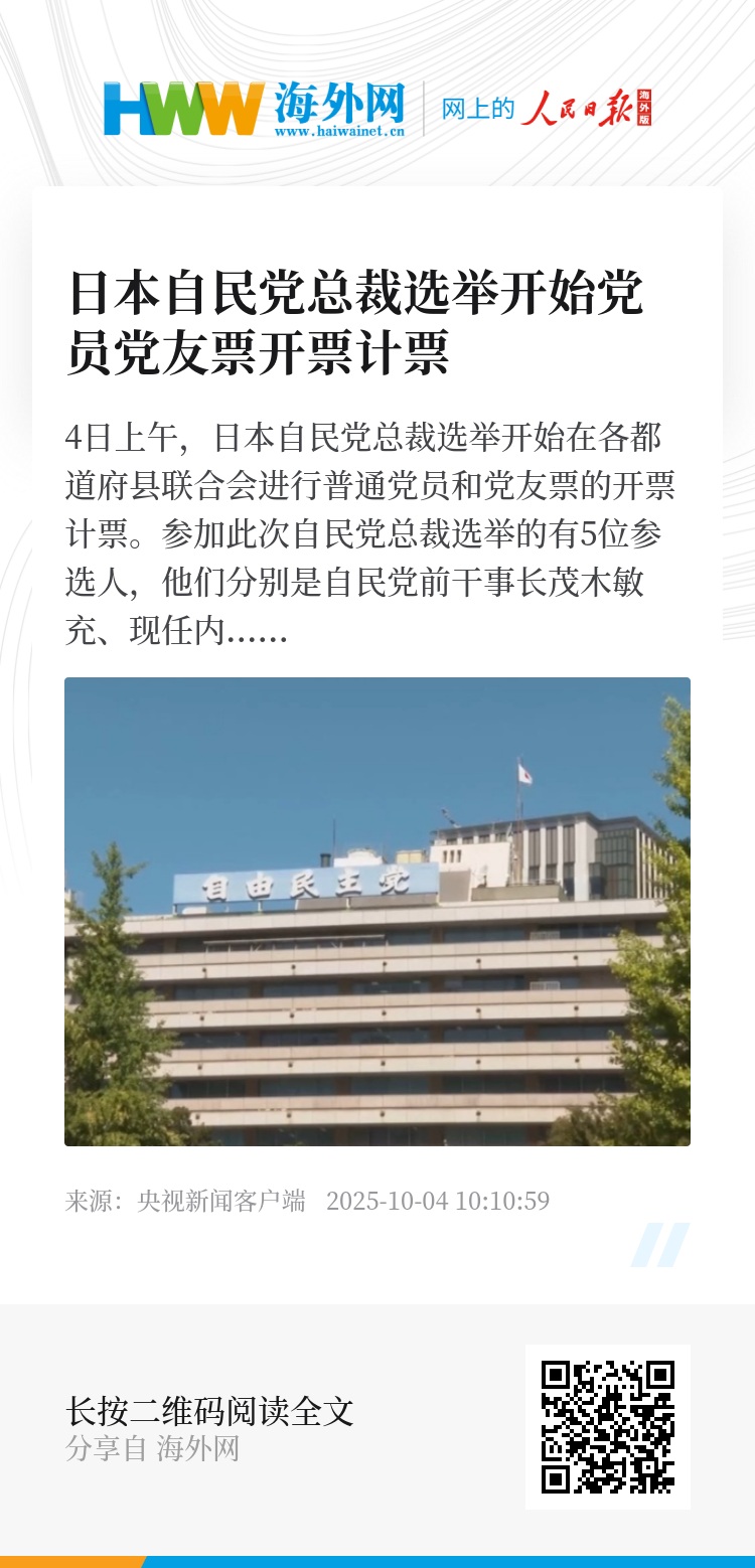 各地普通党员和党友的投票环节已于此前结束,国会议员投票则将于4日13时开始,大约在14时10分公布第一轮投票结果。第一轮投票如果没有候选者获得过半数支持,则将进入最终投票环节,结果预计在15时20分前后揭晓。新任自民党总裁的记者会计划在当天傍晚举行。(总台记者 杨红霞 何欣蕾)