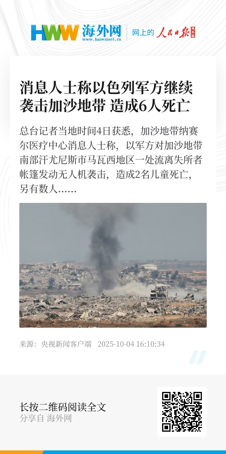 媒体报道称,这是自巴勒斯坦伊斯兰抵抗运动(哈马斯)积极回应美总统特朗普的“20点计划”、特朗普要求以色列“立即”停止对该地带的袭击以来,首次确认的人员伤亡。
