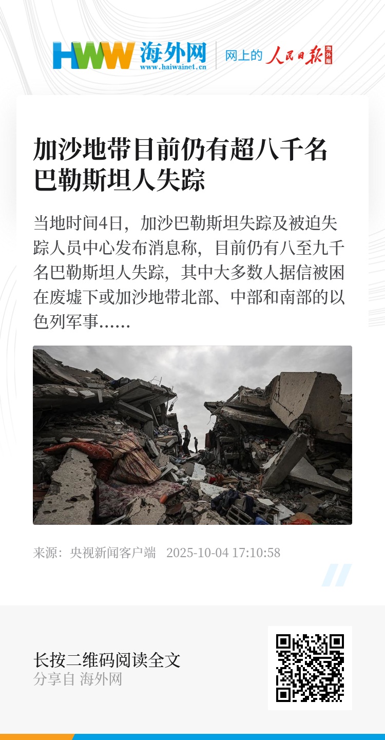 当地时间4日,加沙巴勒斯坦失踪及被迫失踪人员中心发布消息称,目前仍有八至九千名巴勒斯坦人失踪,其中大多数人据信被困在废墟下或加沙地带北部、中部和南部的以色列军事部署区。
