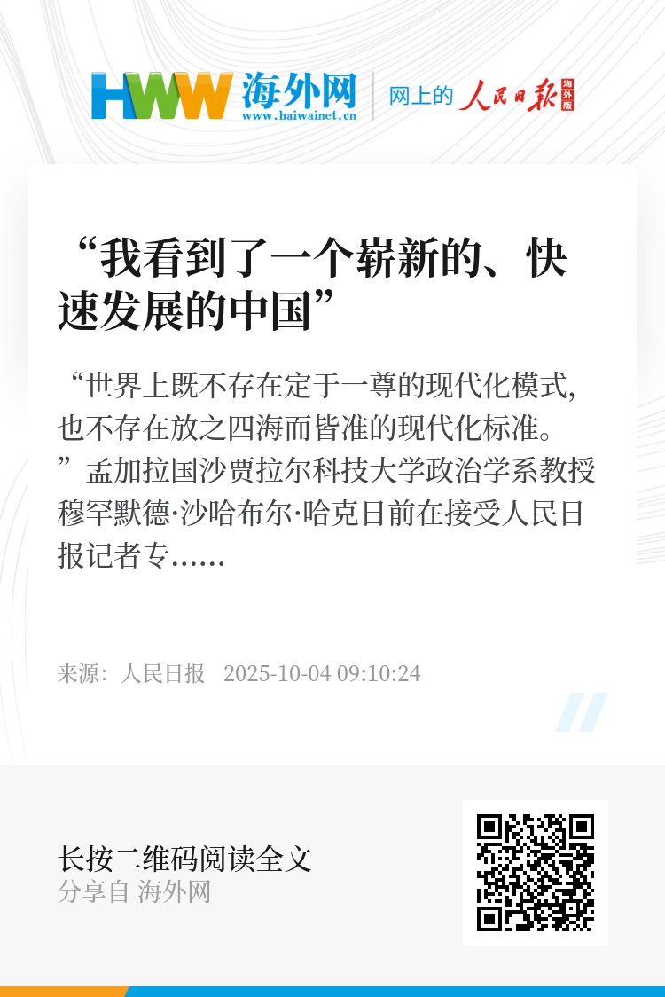 “世界上既不存在定于一尊的现代化模式,也不存在放之四海而皆准的现代化标准。”孟加拉国沙贾拉尔科技大学政治学系教授穆罕默德·沙哈布尔·哈克日前在接受人民日报记者专访时表示,中国式现代化以其独特的理念、实践和巨大成就,为世界提供了一种全新的发展模式和路径选择。在全球发展的浪潮中,中国式现代化正指引全球南方共同探索更加公平、更可持续、更加包容的发展道路。