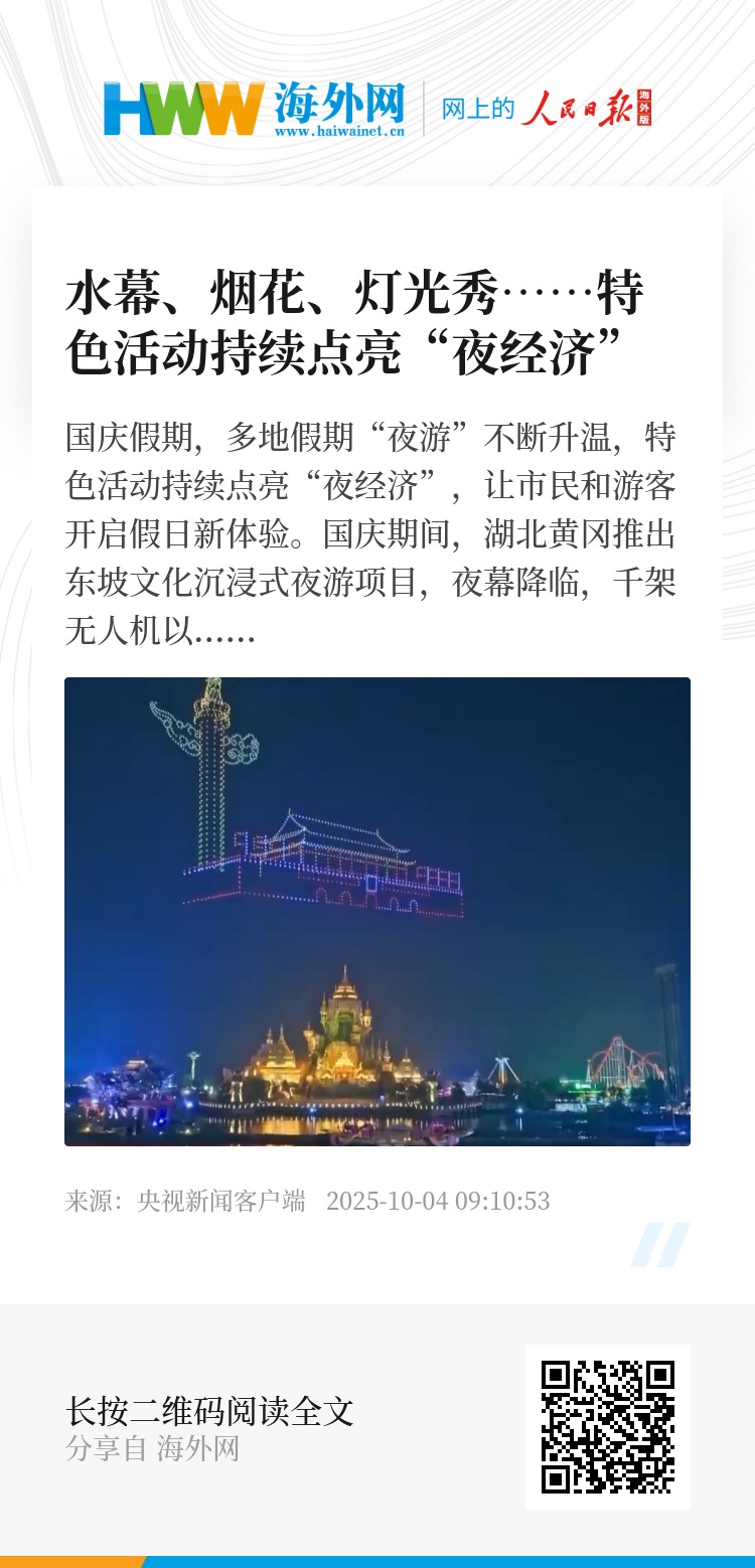 国庆期间,湖北黄冈推出东坡文化沉浸式夜游项目,夜幕降临,千架无人机以夜空为幕,勾勒出“大江东去”的壮阔意境;千年非遗“打铁花”在湖面绽放;黄冈遗爱湖化身立体舞台,“梦回大宋”“赤壁怀古”等八大场景渐次展开。游客乘船夜游,在桨声灯影中开启一场穿越时空的东坡文化之旅。