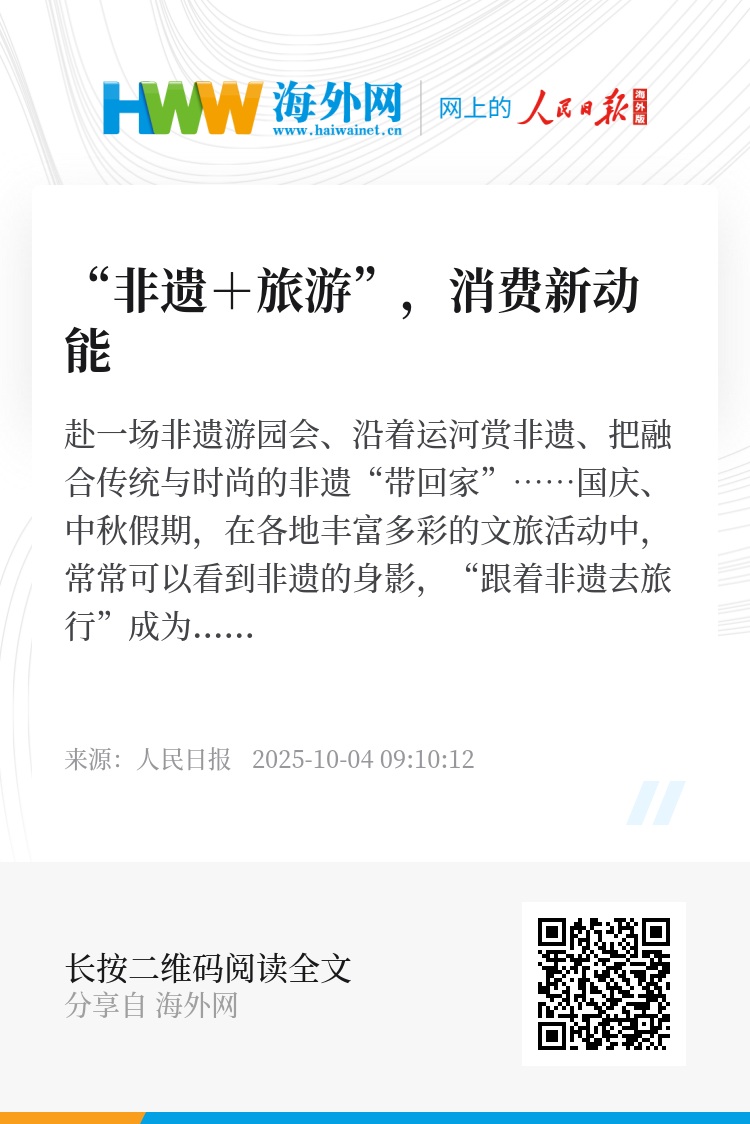 赴一场非遗游园会、沿着运河赏非遗、把融合传统与时尚的非遗“带回家”……国庆、中秋假期,在各地丰富多彩的文旅活动中,常常可以看到非遗的身影,“跟着非遗去旅行”成为新时尚。