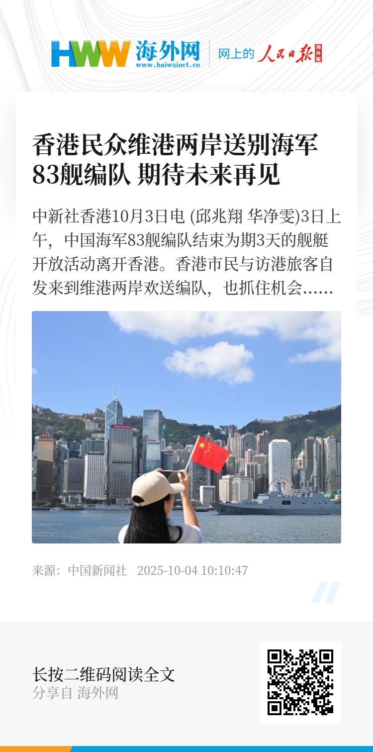 中新社香港10月3日电 (邱兆翔 华净雯)3日上午,中国海军83舰编队结束为期3天的舰艇开放活动离开香港。香港市民与访港旅客自发来到维港两岸欢送编队,也抓住机会再睹海军风采。