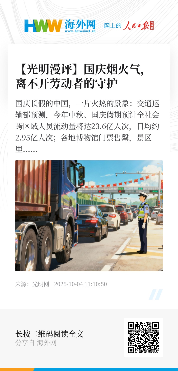 节日的意义,在于让人们在休憩中感受生活的美好;而劳动者的坚守,恰恰是对这份美好的守护。可以说,国庆假期里,每一位在岗劳动者都是消费烟火气的守护者,是经济韧性的构建者。他们用责任和付出守护着流动的中国,托举着消费的热度,更用行动证明,中国经济的韧性,就藏在这些平凡而坚定的坚守之中。向他们致敬,也向这份生生不息的经济活力致敬。(郝悦)