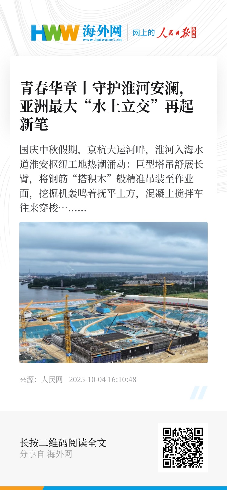 国庆中秋假期,京杭大运河畔,淮河入海水道淮安枢纽工地热潮涌动:巨型塔吊舒展长臂,将钢筋“搭积木”般精准吊装至作业面,挖掘机轰鸣着抚平土方,混凝土搅拌车往来穿梭……亚洲最大“水上立交”的钢铁骨架,正从江淮水网间拔节生长。