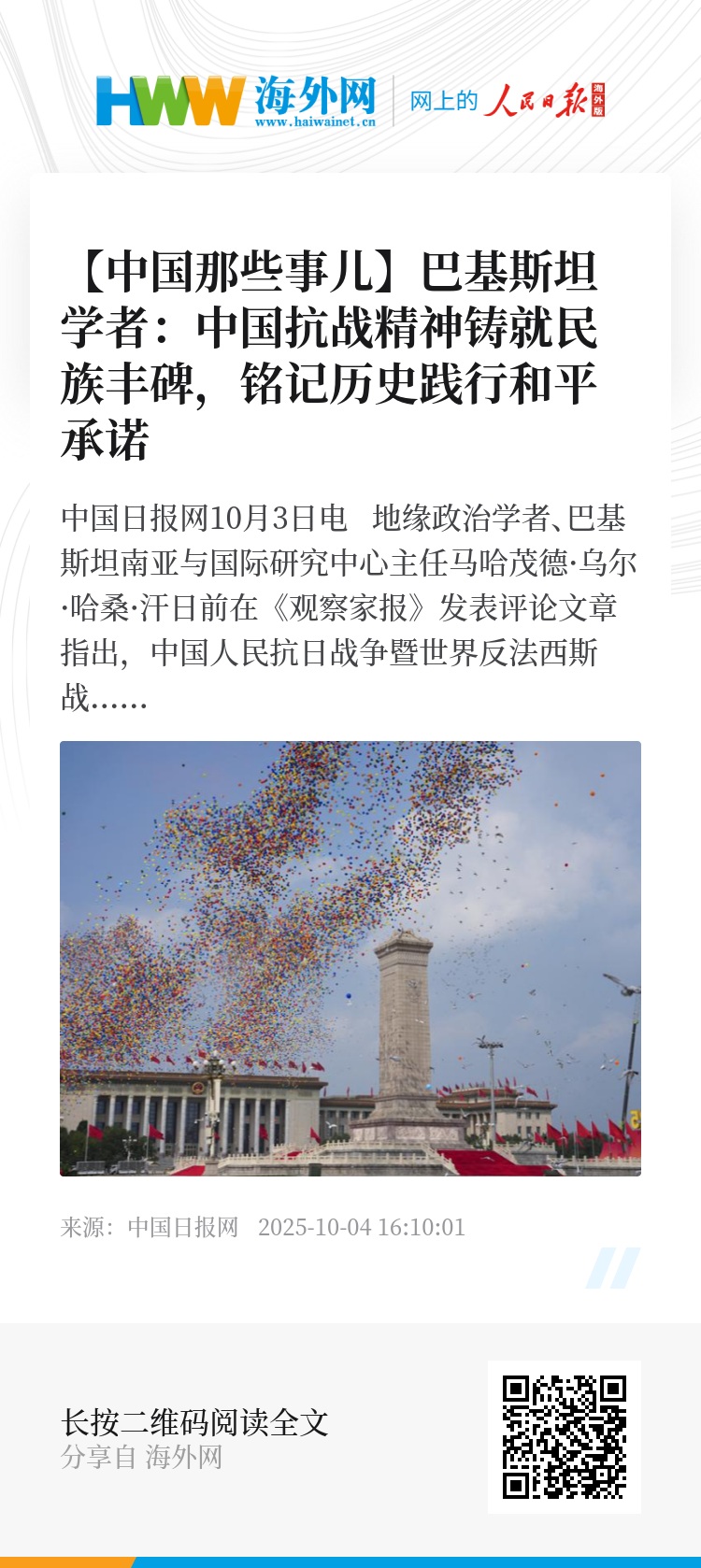 中国日报网10月3日电 地缘政治学者、巴基斯坦南亚与国际研究中心主任马哈茂德·乌尔·哈桑·汗日前在《观察家报》发表评论文章指出,中国人民抗日战争暨世界反法西斯战争胜利80周年纪念活动展现了中国对维护稳定与繁荣的坚定承诺,弘扬了为国家荣誉、爱国主义、主权和领土完整而牺牲奉献、奋勇抗争的精神。