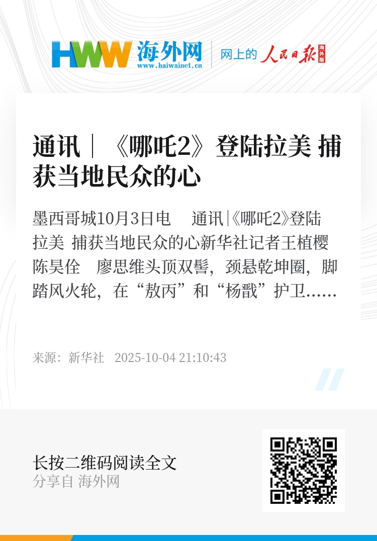 9月底至10月初,《哪吒2》在秘鲁、墨西哥、巴西、哥伦比亚、委内瑞拉、玻利维亚、阿根廷、巴拿马、智利等国陆续上映,凭借引人入胜的故事情节、震撼的视觉效果和丰富的精神意涵,在拉美国家大银幕上掀起一阵中国风。