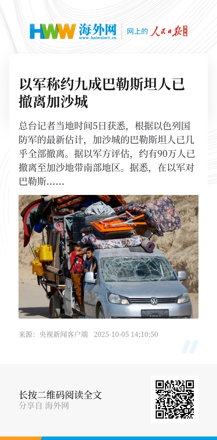 总台记者当地时间5日获悉,根据以色列国防军的最新估计,加沙城的巴勒斯坦人已几乎全部撤离。据以军方评估,约有90万人已撤离至加沙地带南部地区。