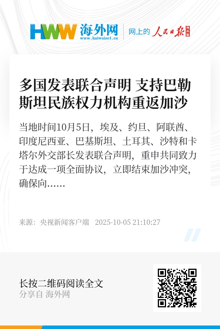 声明还强调,支持巴勒斯坦民族权力机构重返加沙,并建立一个保障各方安全的机制,最终促成以色列全面撤军和加沙重建,并为实现基于“两国方案”的和平和公正铺平道路。