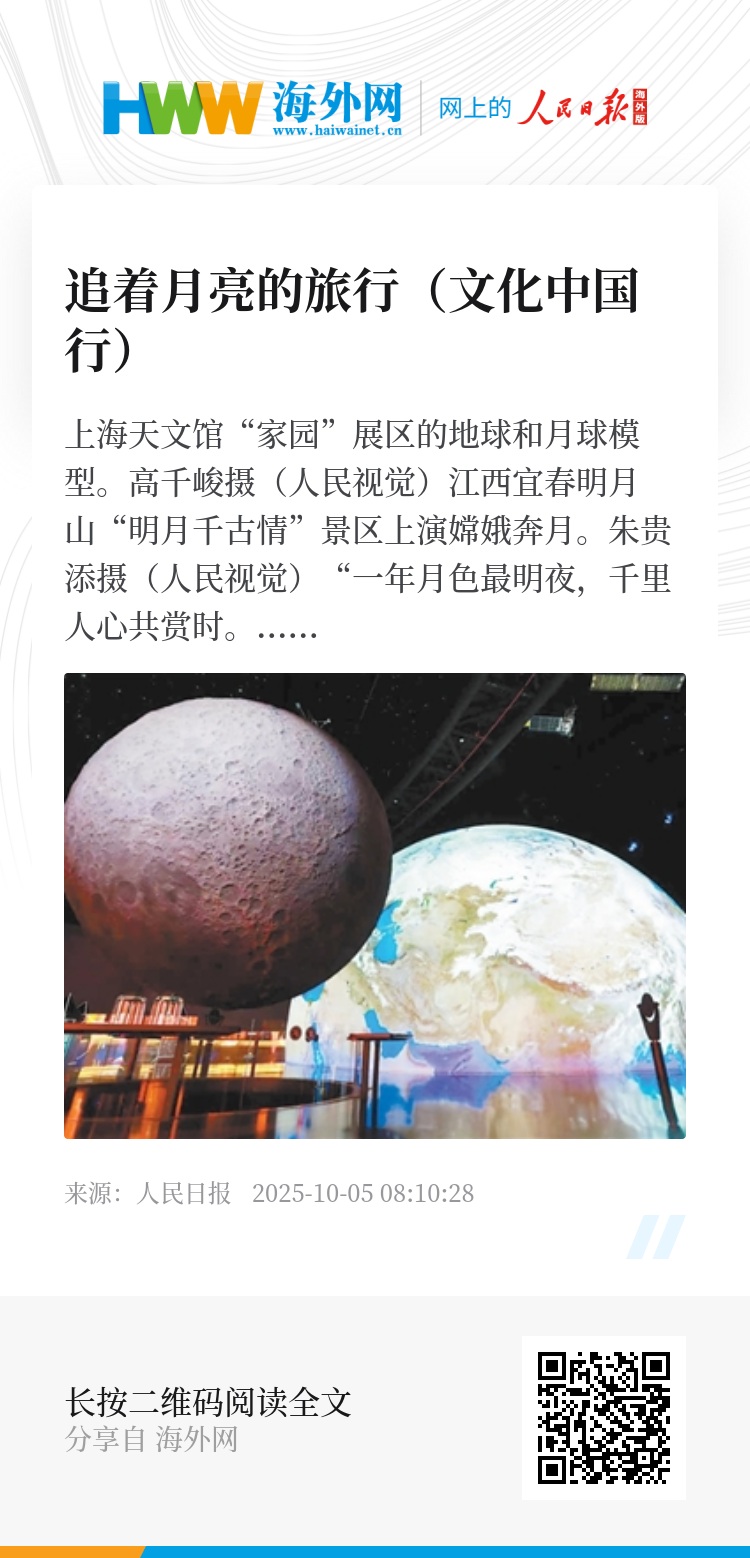 随着国家经济社会发展、人民生活水平提高和科技进步驱动文化创新,人们过节赏月的形式也更加丰富多样——在上海,天文馆内传统文化与现代科技有机融合,打造出穿越时空的“月球漫步”;在江西宜春,连续多年举办的月亮文化节令绿水青山间蕴藏满满“含月量”;在山西介休,古老建筑与满月遥相呼应,营造出独具中式浪漫的赏月“氛围感”……一趟趟“追着月亮的旅行”,折射出欣欣向荣的假日旅游市场,展现出中华优秀传统文化创造性转化、创新性发展的生动实践,见证了文旅融合高质量发展的时代脉动。