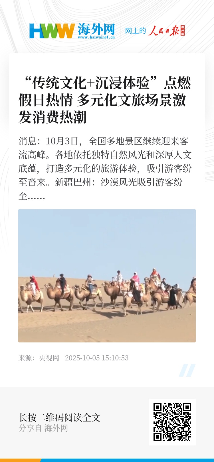 央视网消息:10月3日,全国多地景区继续迎来客流高峰。各地依托独特自然风光和深厚人文底蕴,打造多元化的旅游体验,吸引游客纷至沓来。