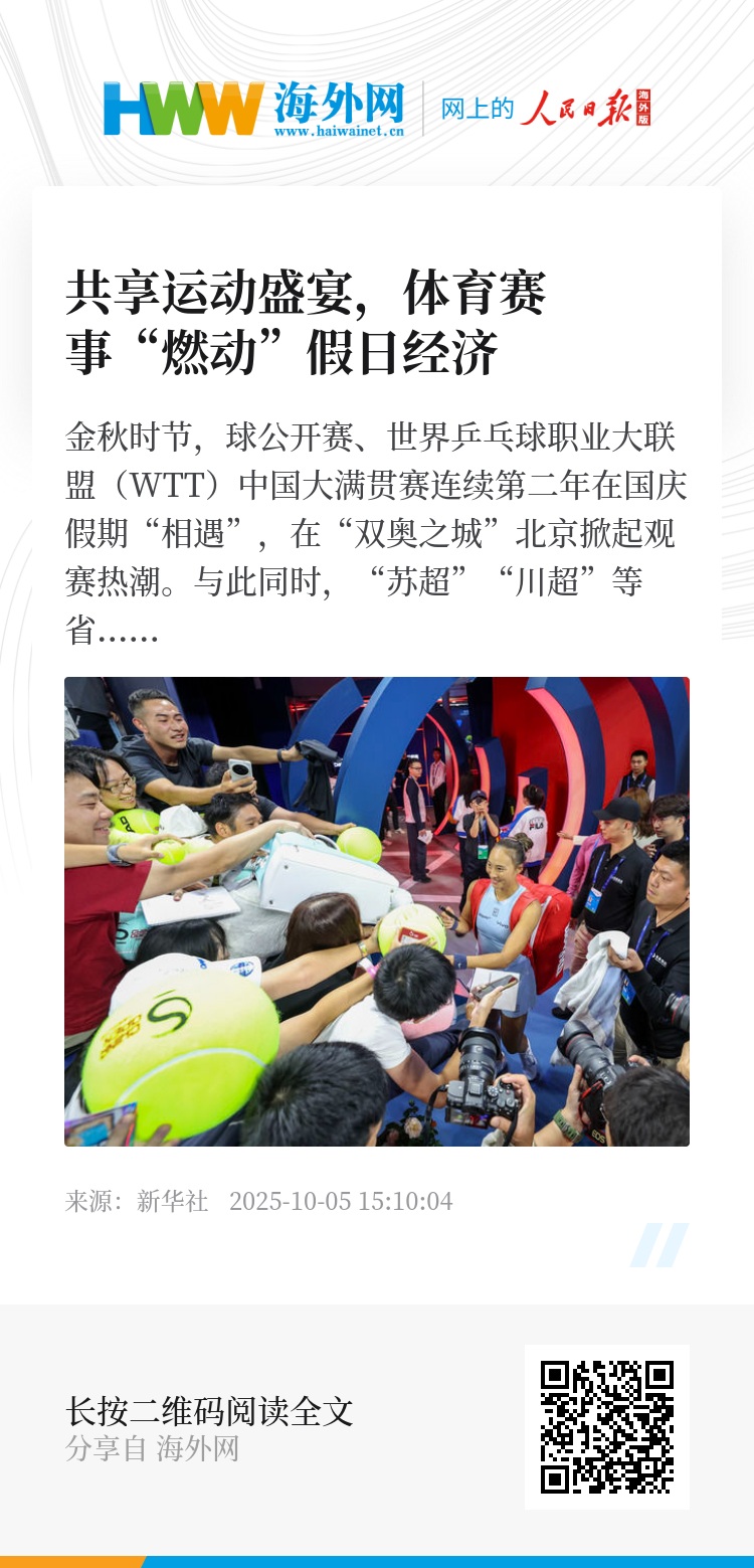 金秋时节,中国网球公开赛、世界乒乓球职业大联盟(WTT)中国大满贯赛连续第二年在国庆假期“相遇”,在“双奥之城”北京掀起观赛热潮。与此同时,“苏超”“川超”等省级业余足球赛事激战正酣,各种路跑、骑行、游泳等全民健身活动也在全国各地火热开展,为假日注入满满活力……