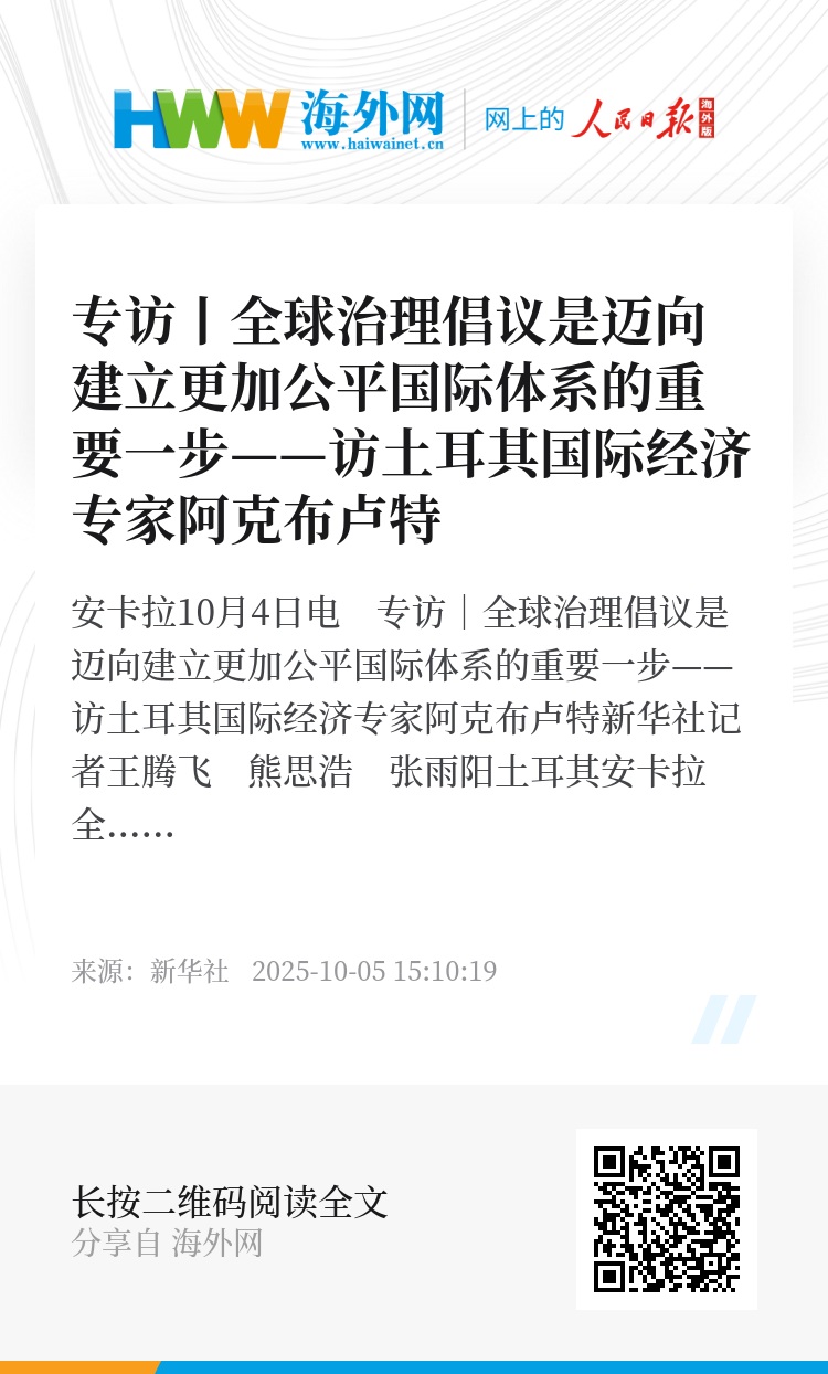 新华社安卡拉10月4日电 专访|全球治理倡议是迈向建立更加公平国际体系的重要一步——访土耳其国际经济专家阿克布卢特
