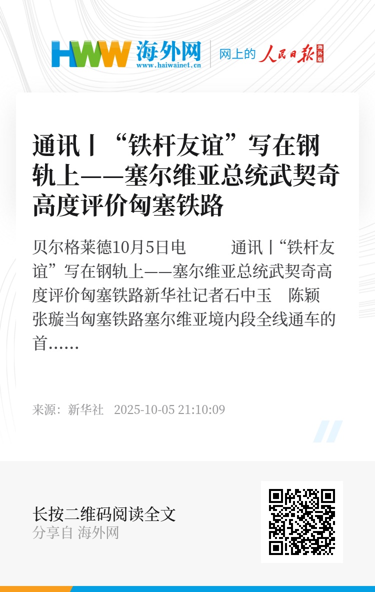 新华社贝尔格莱德10月5日电 通讯丨“铁杆友谊”写在钢轨上——塞尔维亚总统武契奇高度评价匈塞铁路