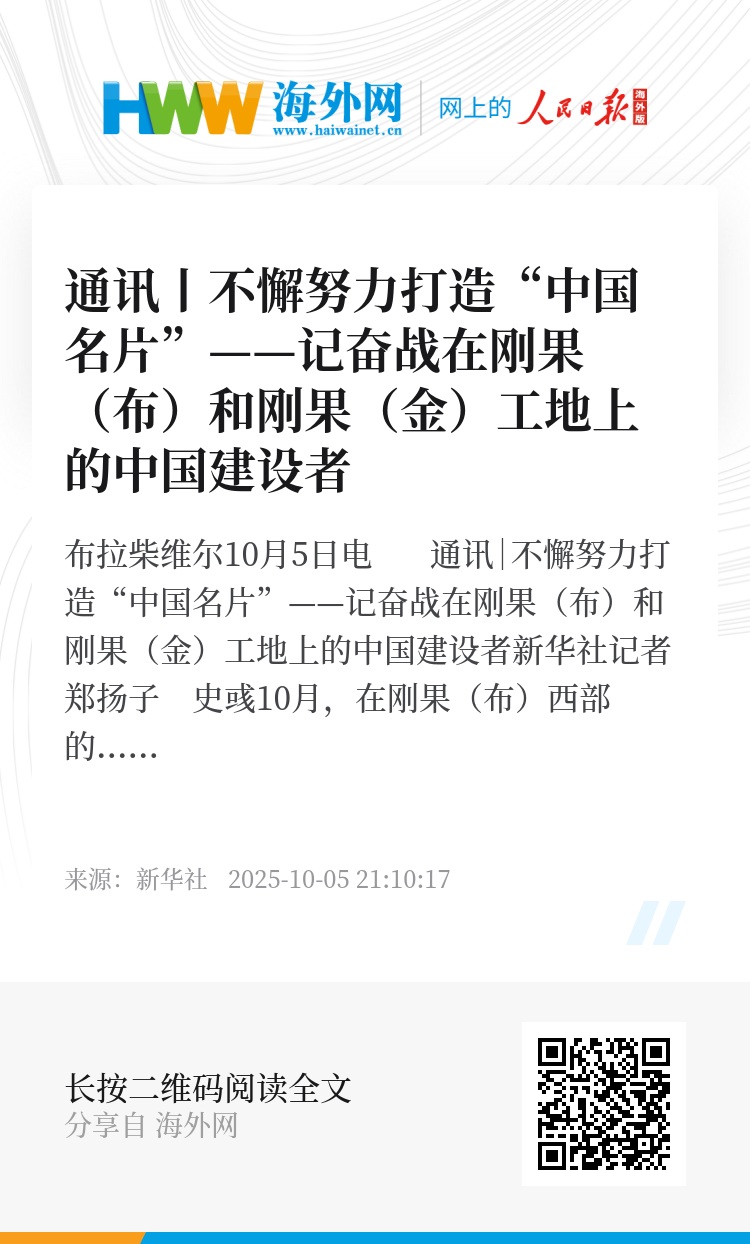 在刚果(布)的密林深处,在刚果(金)的都市旁,中国建设者在不懈努力,为当地发展注入活力。他们的奋战,汇成中非合作的时代洪流;他们的足迹,成为一张张鲜活的“中国名片”。