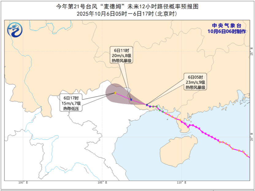 中央气象台10月6日06时发布台风蓝色预警。今年第21号台风“麦德姆”的中心已于今天(6日)凌晨1点10分前后在广西防城港市沿海再次登陆,登陆时中心附近最大风力有10级(28米/秒,强热带风暴级),中心最低气压为982百帕。早晨5点钟其中心仍位于广西防城港市境内,就是北纬21.9度、东经107.8度,中心附近最大风力有9级(23米/秒,热带风暴级),中心最低气压为990百帕。