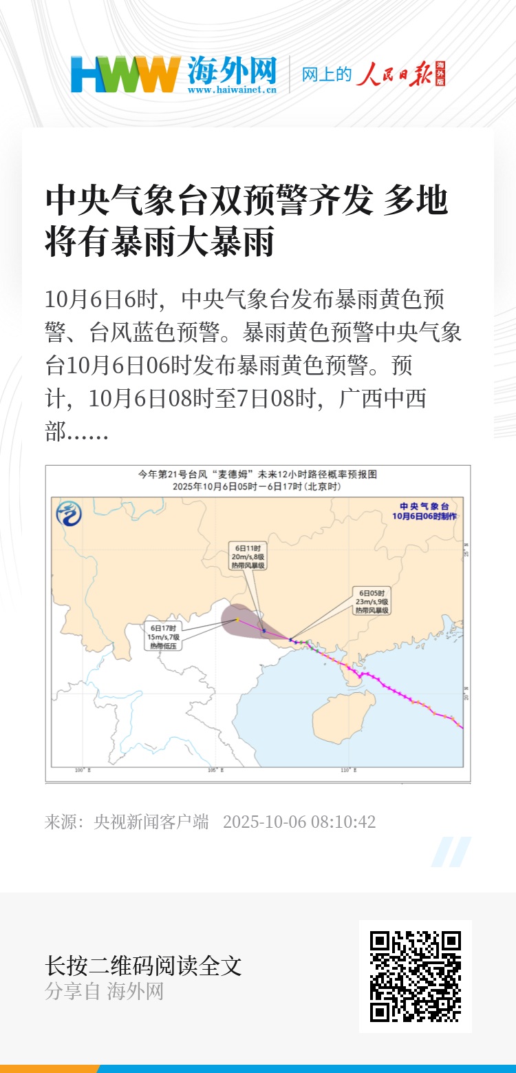 10月6日6时,中央气象台发布暴雨黄色预警、台风蓝色预警。