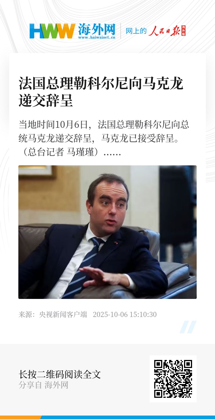 当地时间10月6日,法国总理勒科尔尼向总统马克龙递交辞呈,马克龙已接受辞呈。 (总台记者 马瑾瑾)
