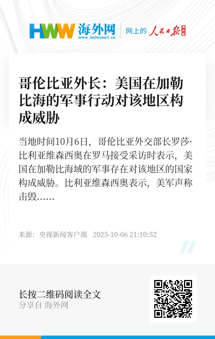 当地时间10月6日,哥伦比亚外交部长罗莎·比利亚维森西奥在罗马接受采访时表示,美国在加勒比海域的军事存在对该地区的国家构成威胁。