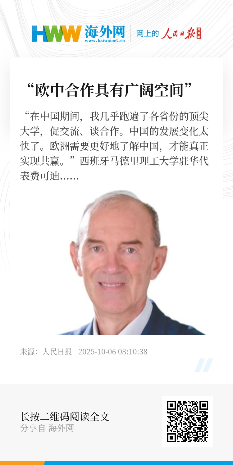 “在中国期间,我几乎跑遍了各省份的顶尖大学,促交流、谈合作。中国的发展变化太快了。欧洲需要更好地了解中国,才能真正实现共赢。”西班牙马德里理工大学驻华代表费可迪在接受人民日报记者专访时表示,“欧中可以充分发挥各自优势,携手推动科技、教育、产业等领域合作升级。”