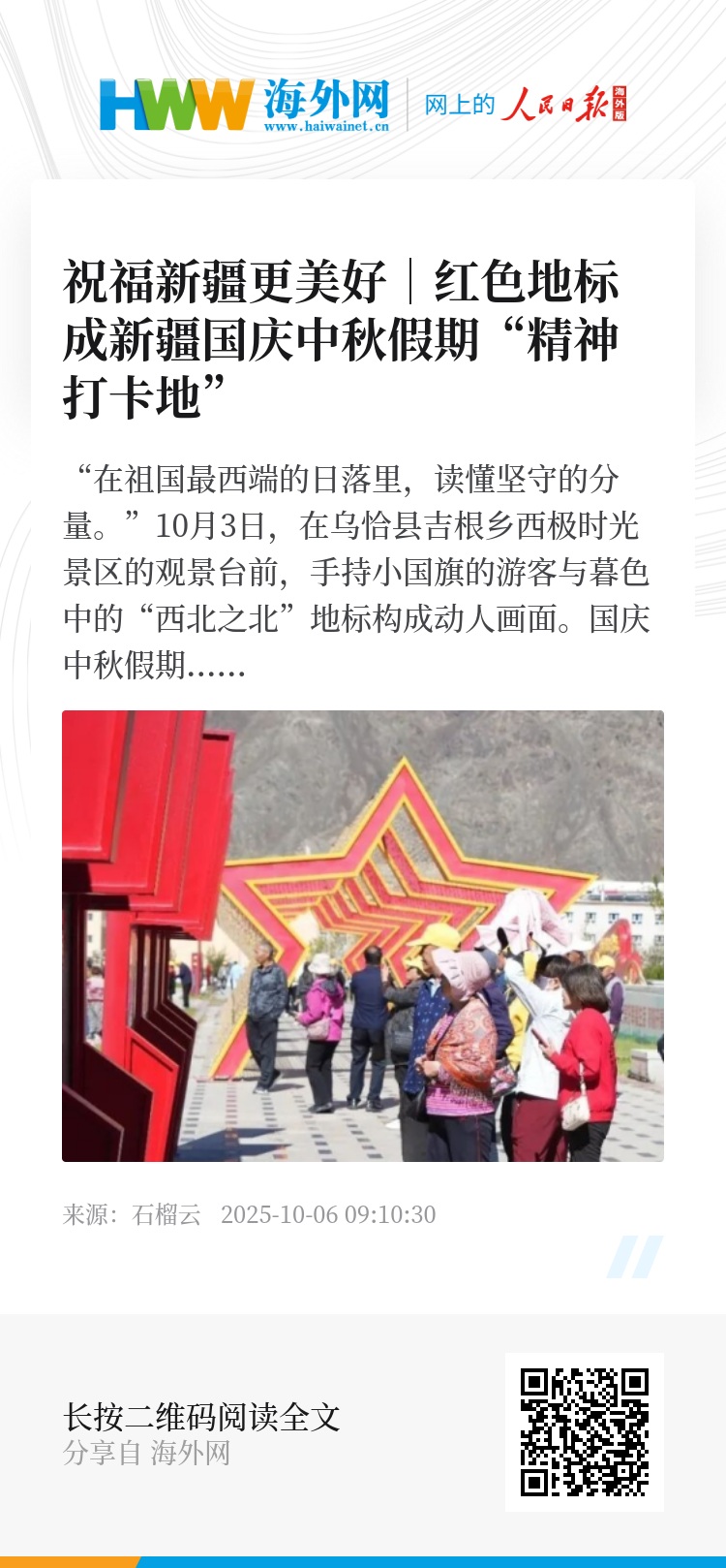 “在祖国最西端的日落里,读懂坚守的分量。”10月3日,在乌恰县吉根乡西极时光景区的观景台前,手持小国旗的游客与暮色中的“西北之北”地标构成动人画面。国庆中秋假期,新疆大地上的红色地标迎来客流高峰,从喀喇昆仑山下的纪念馆到塔河之畔的军垦遗址,成为各族群众与游客追寻初心的“精神打卡地”,让他们在奋斗故事中感悟家国情怀。