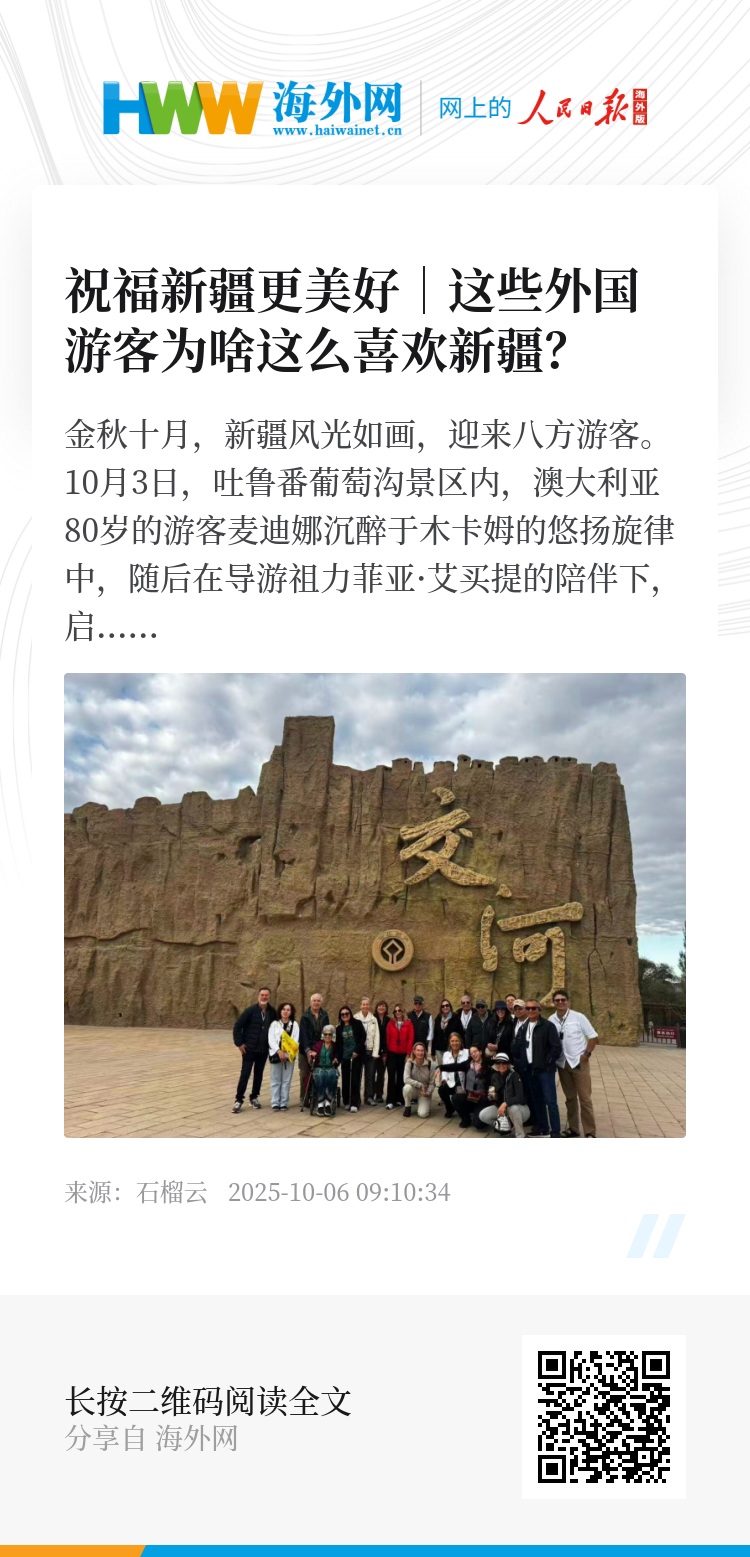 “我还想去新疆国际大巴扎,听说那里有许多非遗文创产品,想挑选一些带回澳大利亚,送给亲友。”麦迪娜说。自9月踏上新疆之旅以来,这片土地的每一处风景、每一份人情都让她流连忘返:喀什古城的繁华让她惊叹,坎儿井的古老智慧令她称奇,吐鲁番葡萄的甘甜沁人心脾,而新疆各族群众脸上真诚的笑容,更让她感受到生活的美好与温暖。