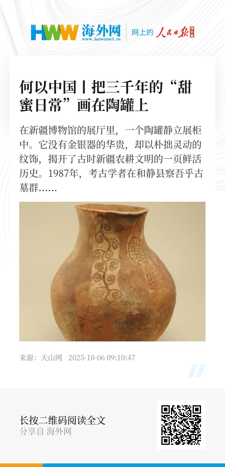 在新疆博物馆的展厅里,一个陶罐静立展柜中。它没有金银器的华贵,却以朴拙灵动的纹饰,揭开了古时新疆农耕文明的一页鲜活历史。