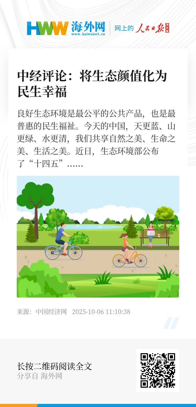 良好生态环境是最公平的公共产品,也是最普惠的民生福祉。今天的中国,天更蓝、山更绿、水更清,我们共享自然之美、生命之美、生活之美。