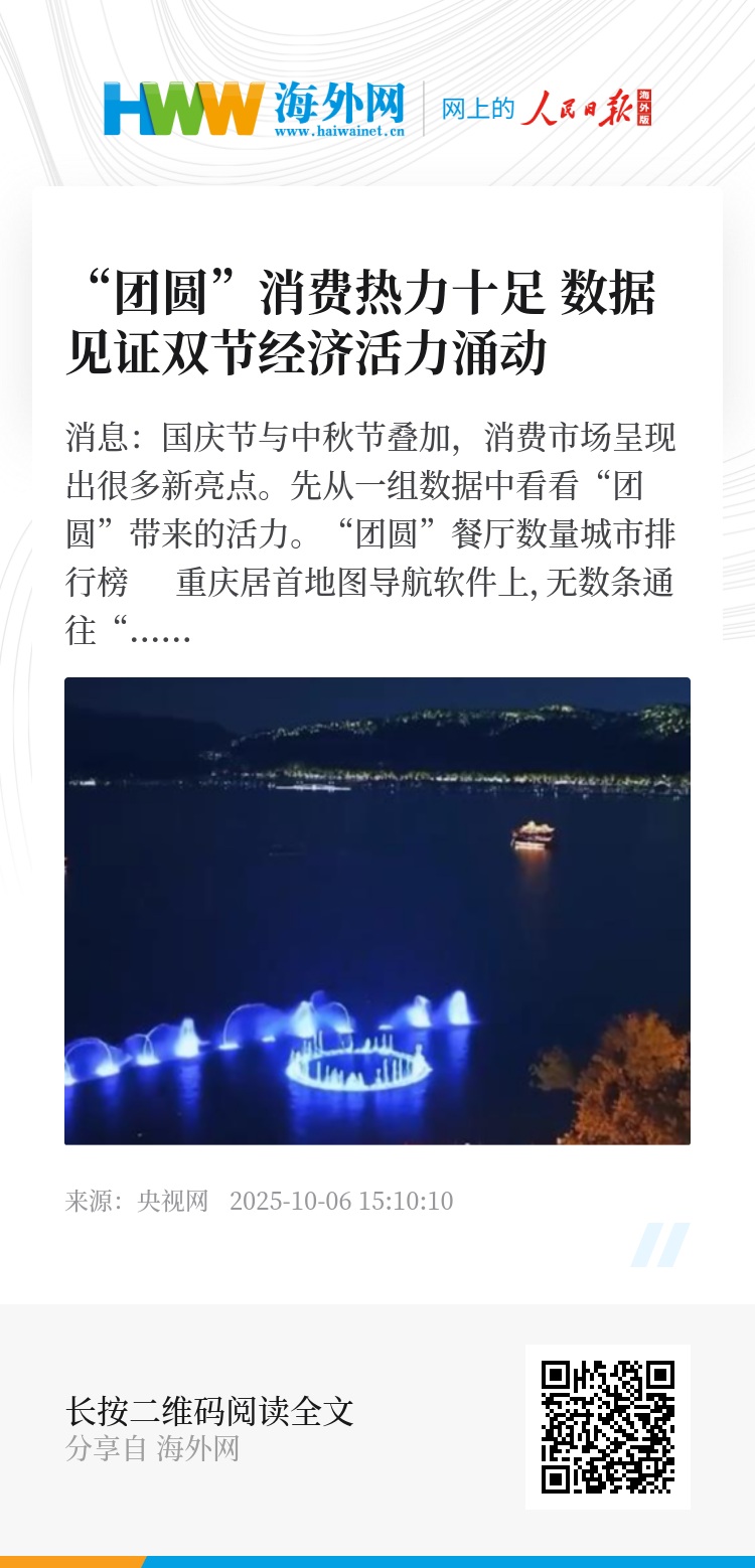 央视网消息:国庆节与中秋节叠加,消费市场呈现出很多新亮点。先从一组数据中看看“团圆”带来的活力。