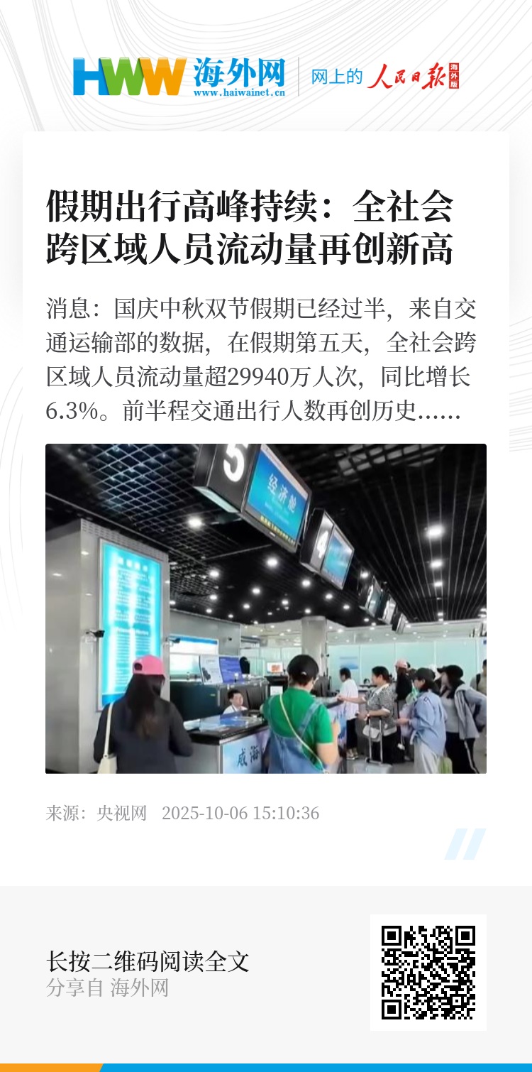 国庆中秋假期前半程,全社会跨区域人员流动量再创历史新高,累计约12.43亿人次,日均值超过3.1亿人次,展现出强劲的出行活力。