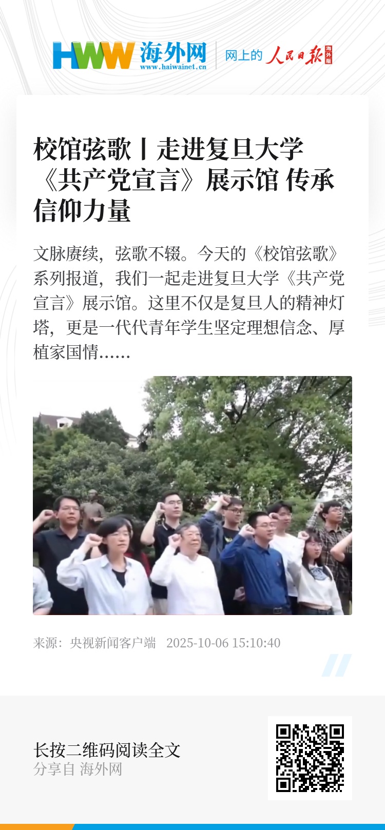 文脉赓续,弦歌不辍。今天的《校馆弦歌》系列报道,我们一起走进复旦大学《共产党宣言》展示馆。这里不仅是复旦人的精神灯塔,更是一代代青年学生坚定理想信念、厚植家国情怀、汲取奋进力量的重要阵地。