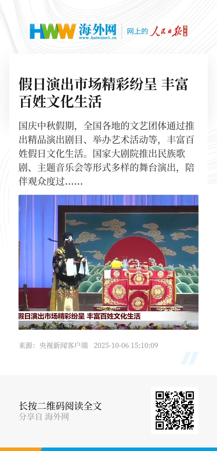 国庆中秋假期,全国各地的文艺团体通过推出精品演出剧目、举办艺术活动等,丰富百姓假日文化生活。