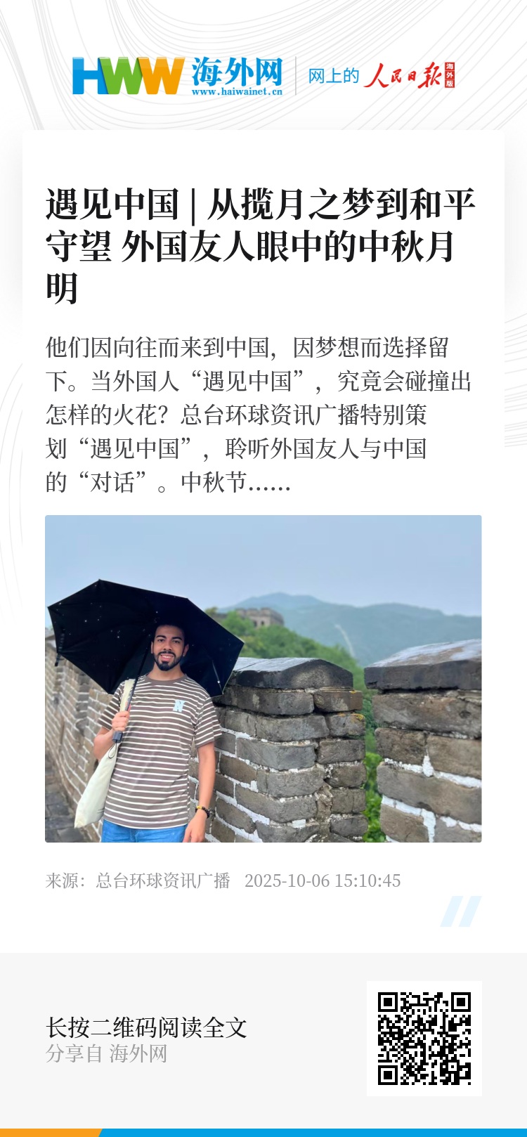 在外国友人看来,中秋月圆既是小家庭团聚的温情时刻,也是大国和平发展的精神注脚;既承载着千年诗意的浪漫,也激励着面向未来的探索。当月光洒向大地,它照亮的不仅是千家万户的团圆时刻,更是人类对和平、探索与文化传承的共同追求。而这轮千古明月所见证的,正是不同文明在相互理解中共同书写的崭新篇章。