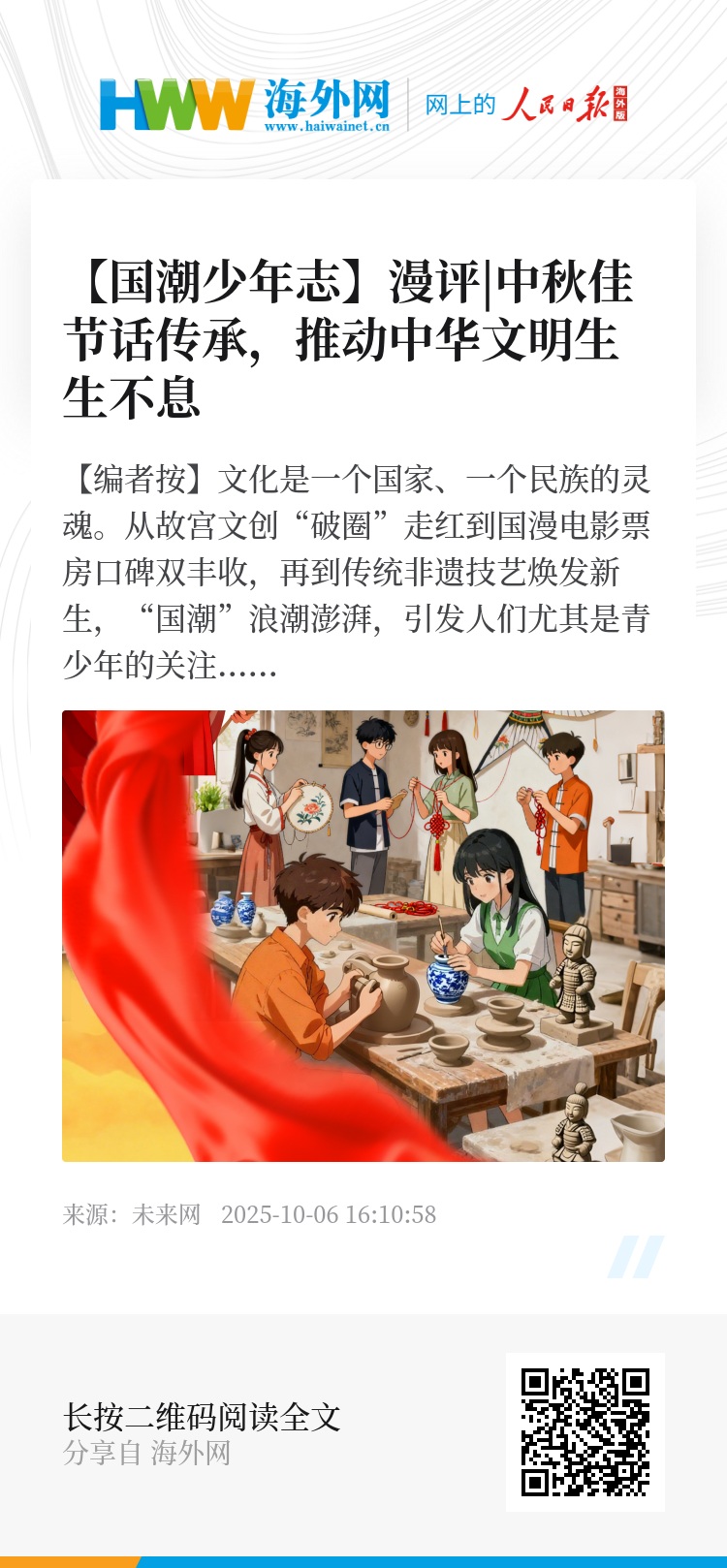 当青少年以创意拥抱“国潮”、用热爱守护传统,那些穿在身上的汉服、学在手中的非遗、藏在镜头里的老物件,便成了文化传承的生动注脚。当中秋的华光映照着青春脸庞,广大青少年正以赤子之心接过文化传承的火炬,让中华文明在时代长河中奔涌向前,生生不息。
