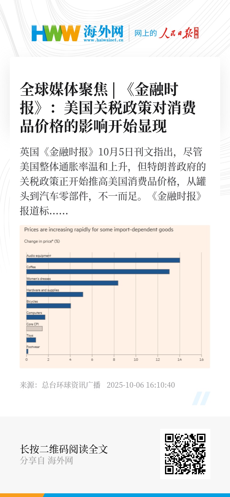 英国《金融时报》10月5日刊文指出,尽管美国整体通胀率温和上升,但特朗普政府的关税政策正开始推高美国消费品价格,从罐头到汽车零部件,不一而足。
