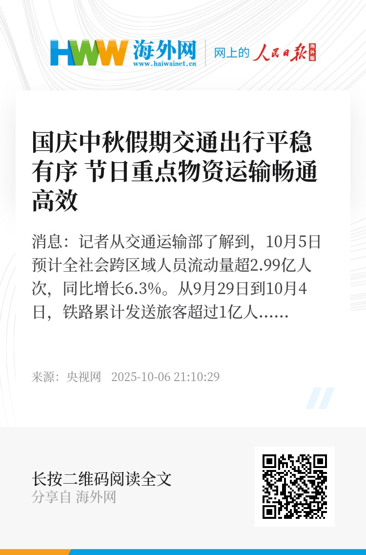 央视网消息:记者从交通运输部了解到,10月5日预计全社会跨区域人员流动量超2.99亿人次,同比增长6.3%。从9月29日到10月4日,铁路累计发送旅客超过1亿人次,运输安全平稳有序。10月5日铁路客流继续保持高位运行,中短途客流持续增多。铁路客运量预计1755万人次。