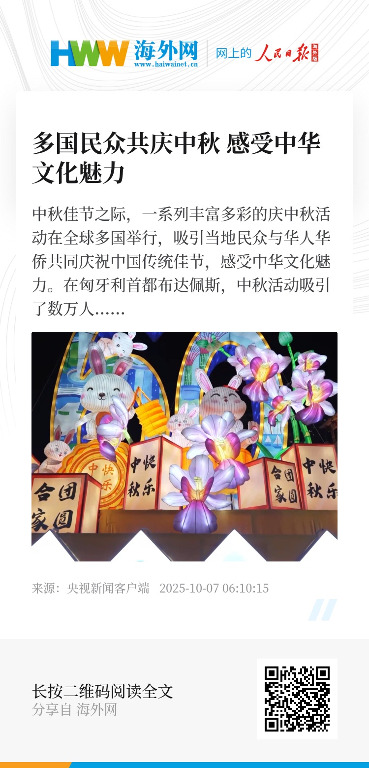 中秋佳节之际,一系列丰富多彩的庆中秋活动在全球多国举行,吸引当地民众与华人华侨共同庆祝中国传统佳节,感受中华文化魅力。