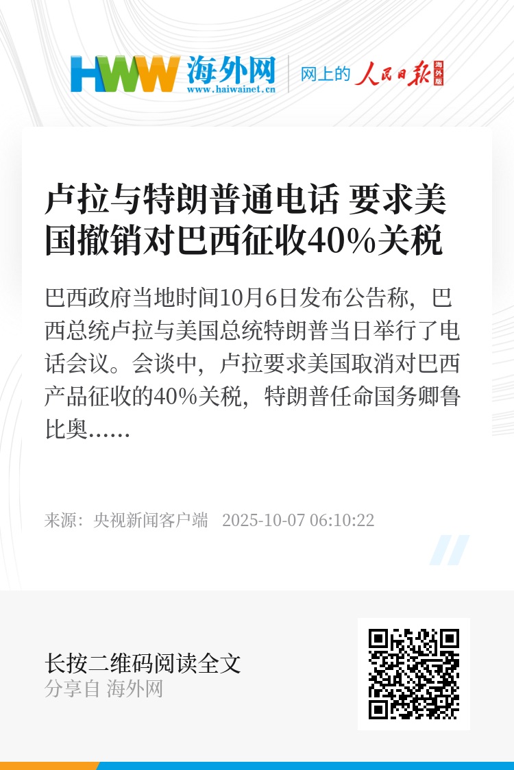 巴西政府当地时间10月6日发布公告称,巴西总统卢拉与美国总统特朗普当日举行了电话会议。会谈中,卢拉要求美国取消对巴西产品征收的40%关税,特朗普任命国务卿鲁比奥继续与巴西副总统阿尔克明进行谈判。