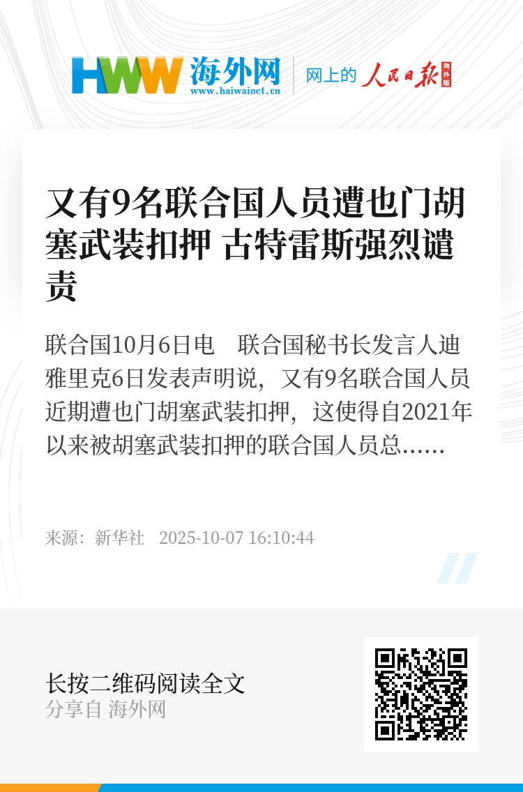 新华社联合国10月6日电 联合国秘书长发言人迪雅里克6日发表声明说,又有9名联合国人员近期遭也门胡塞武装扣押,这使得自2021年以来被胡塞武装扣押的联合国人员总数达到53人。联合国秘书长古特雷斯对此予以强烈谴责。
