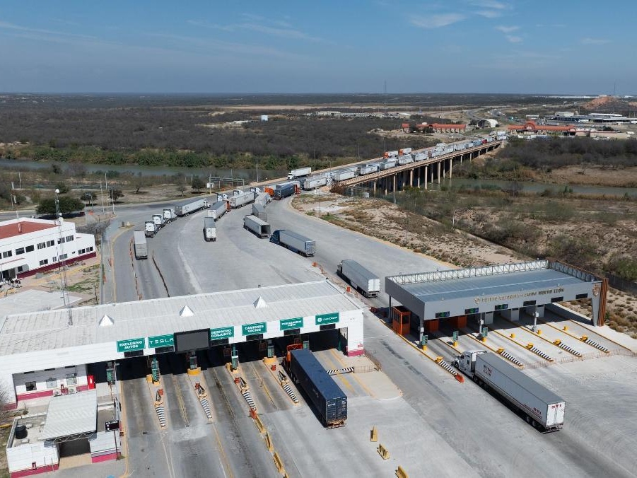 2月15日,在墨西哥新莱昂州哥伦比亚镇,货车通过一处边检站后,准备从国际桥跨越格兰德河进入美国。新华社记者李梦馨摄