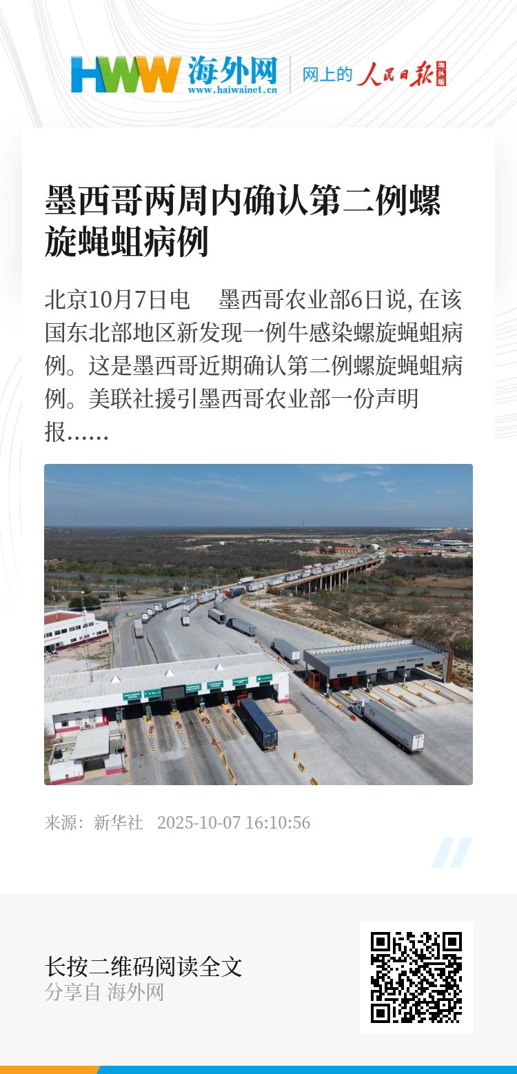 美国农业部长布鲁克·罗林斯6日在社交媒体上说,墨西哥新增病例据信为“个案”,美方将派人独立核实有关情况。