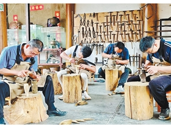 和善均(左一)与徒弟在打制铜器。和善均供图