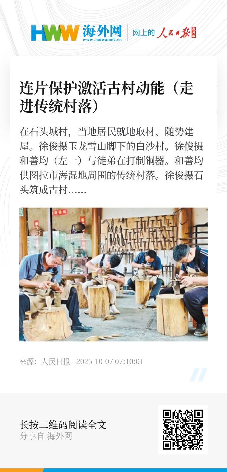 石头筑成古村落、铜具承载老手艺、民宿展现新活力……云南省丽江市玉龙纳西族自治县文化意蕴深厚。截至目前,玉龙县有24个村落先后列入中国传统村落名录。近年来,玉龙县以“突出重点、集群保护、连片发展”为理念,推动风貌保护、文化传承与乡村振兴“同频共振”。2024年,玉龙县入选传统村落集中连片保护利用示范县。