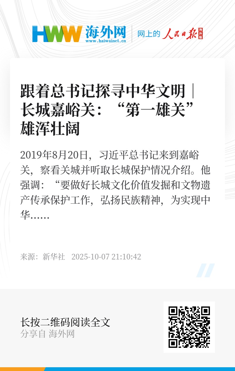 2019年8月20日,习近平总书记来到嘉峪关,察看关城并听取长城保护情况介绍。他强调:“要做好长城文化价值发掘和文物遗产传承保护工作,弘扬民族精神,为实现中华民族伟大复兴的中国梦凝聚起磅礴力量。”