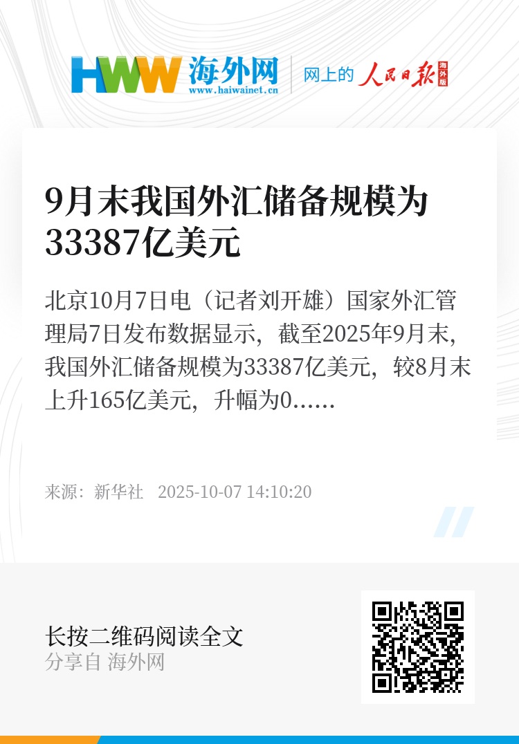 新华社北京10月7日电(记者刘开雄)国家外汇管理局7日发布数据显示,截至2025年9月末,我国外汇储备规模为33387亿美元,较8月末上升165亿美元,升幅为0.5%。